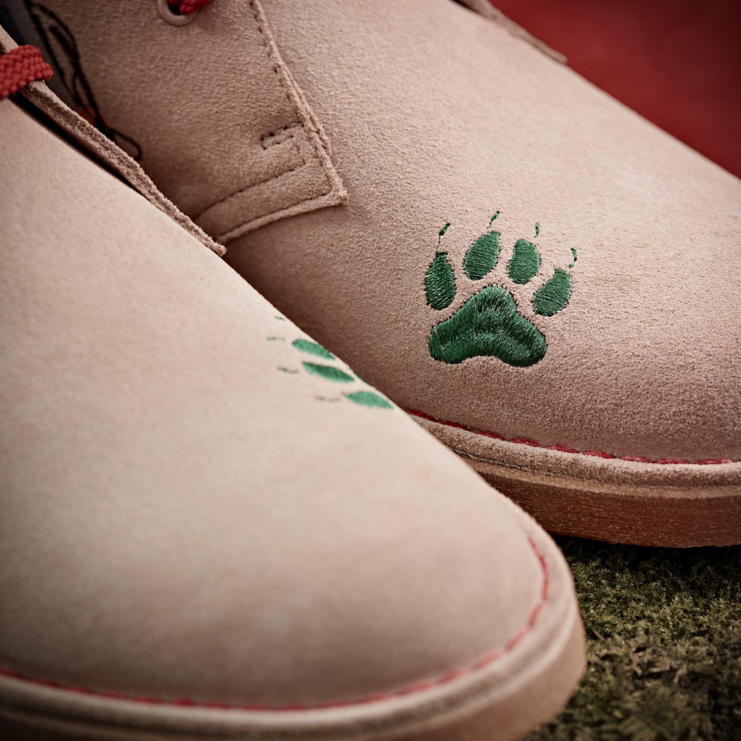 Our iconic Desert Boot takes on Stranger Things in a unique design inspired by the nostalgic team spirit of Hawkins High School. Its sand suede uppers are complete with embroidered badges that pay tribute to The Hawkins Tigers. as well as as a fierce Demogorgon motif in bold red to match the laces. Calling attention to Originals heritage and Stranger Things lore. we've topped the pair with suede logo fobs that immortalise the collaboration.